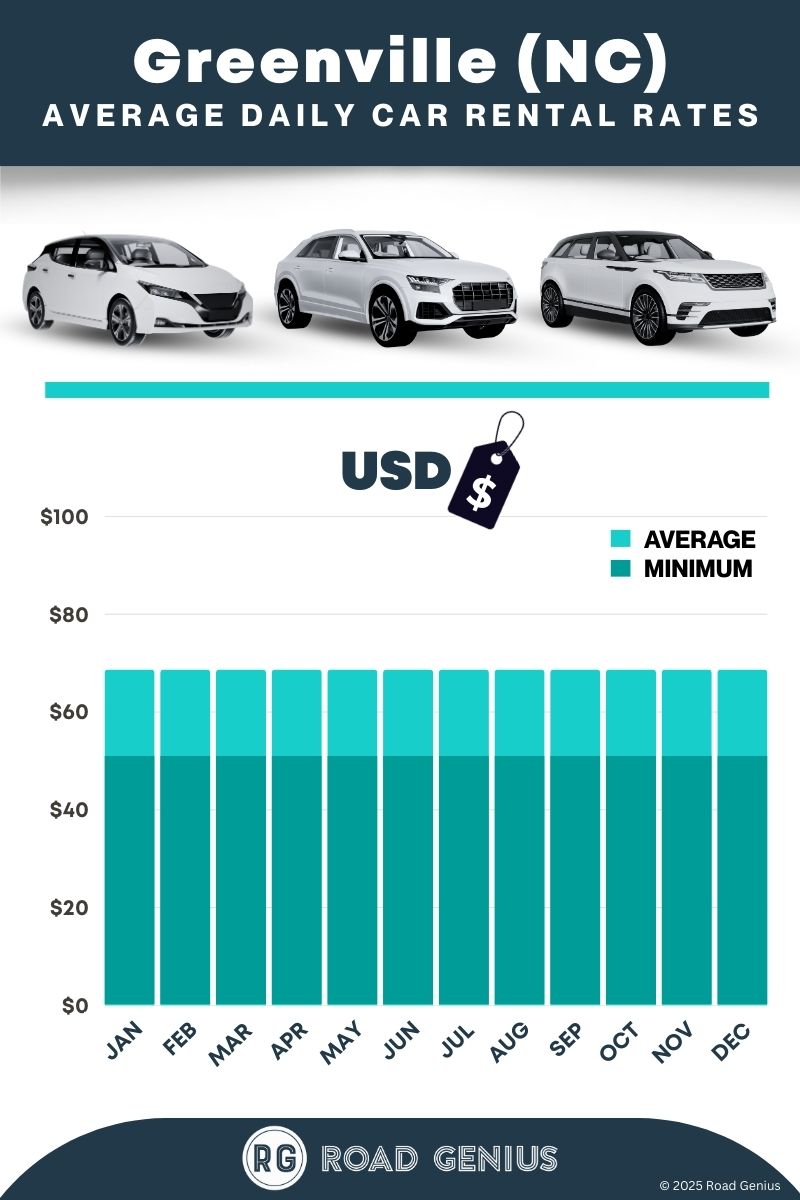 On average, car rentals in Greenville (NC) cost around $65 per day, with the lowest-priced rentals starting at $51 per day.