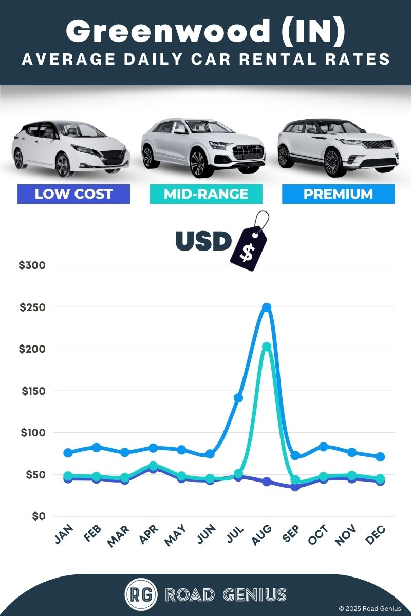 On average, car rentals in Greenwood (IN) cost around $68 per day, with the lowest-priced rentals starting at $35 per day.