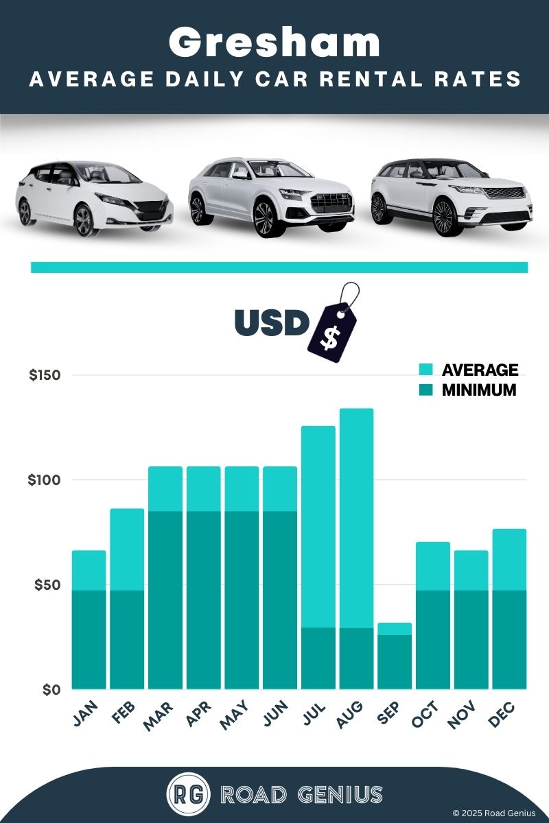 On average, car rentals in Gresham cost around $75 per day, with the lowest-priced rentals starting at $26 per day.