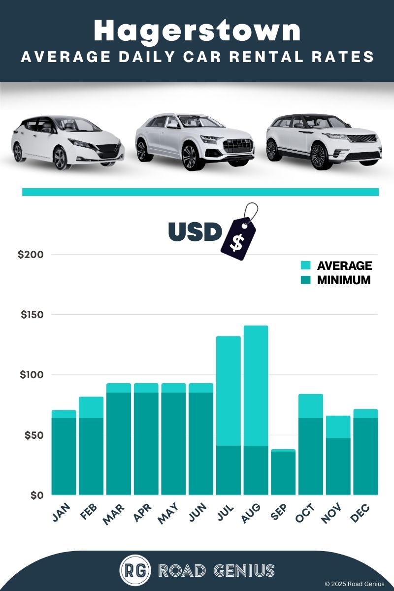 On average, car rentals in Hagerstown cost around $79 per day, with the lowest-priced rentals starting at $36 per day.