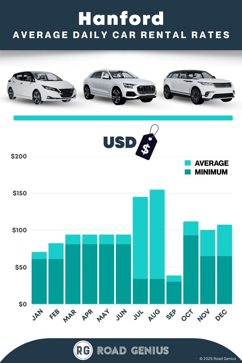 On average, car rentals in Hanford cost around $87 per day, with the lowest-priced rentals starting at $30 per day.