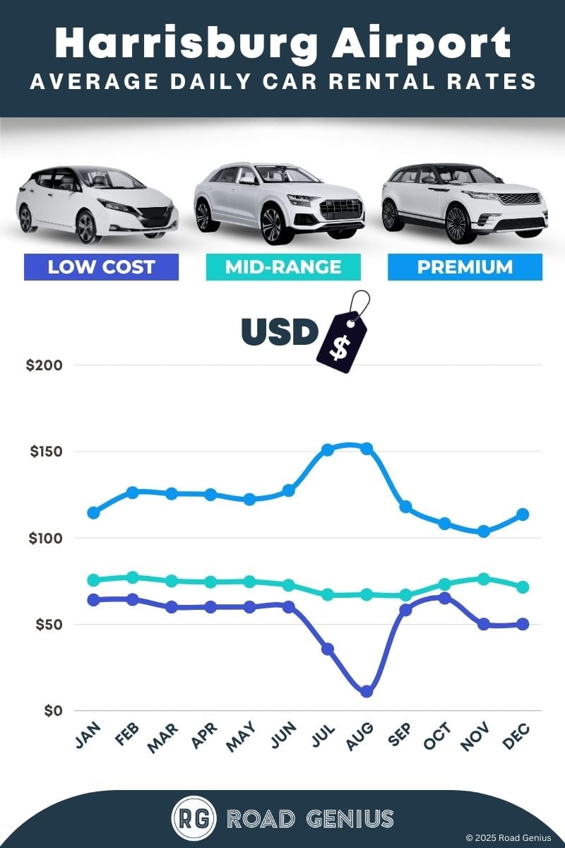 On average, car rentals at Harrisburg Airport cost around $83 per day, with the lowest-priced rentals starting at $11 per day.