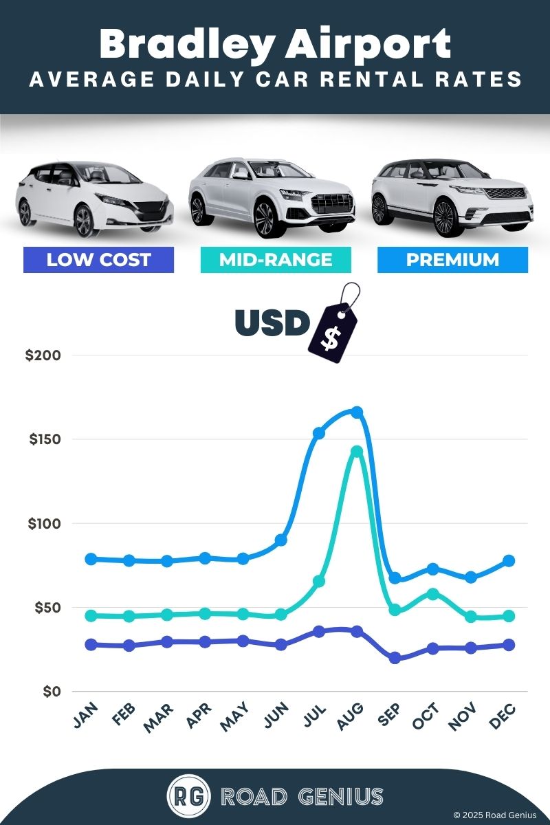 On average, car rentals at Bradley Airport cost around $59 per day, with the lowest-priced rentals starting at $20 per day.