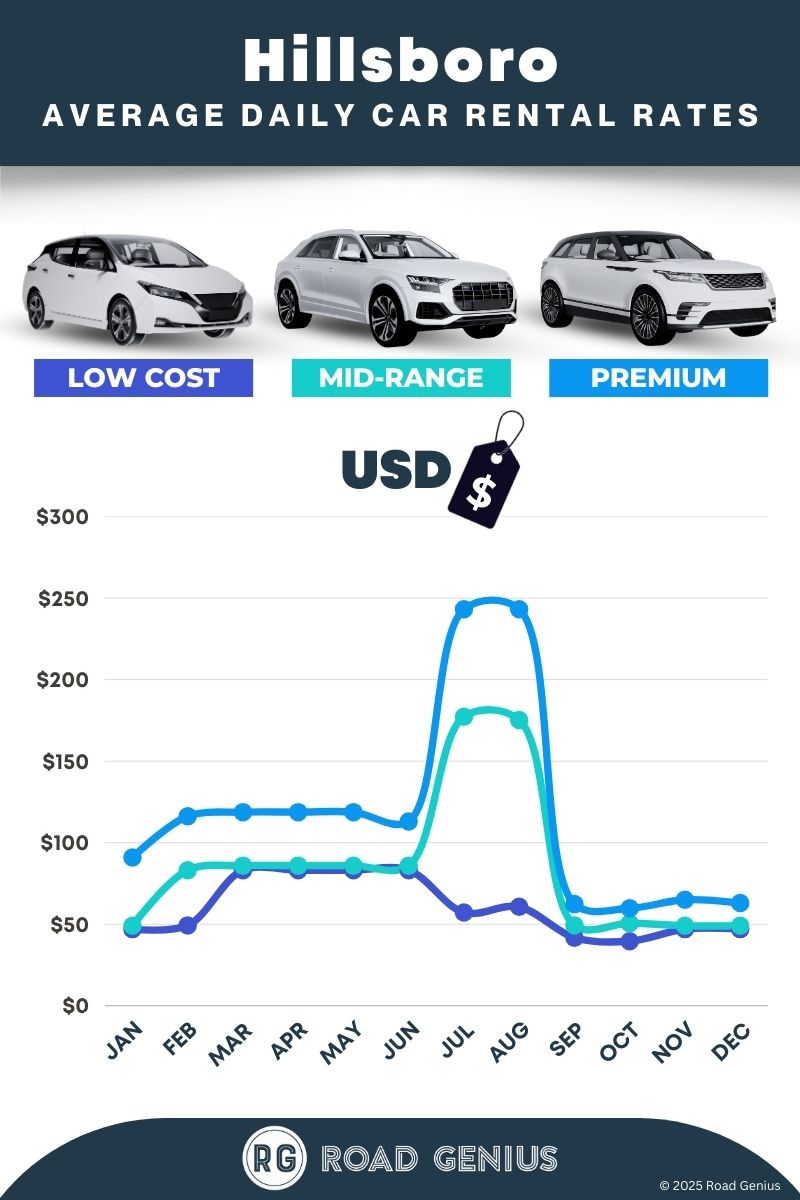 On average, car rentals in Hillsboro cost around $88 per day, with the lowest-priced rentals starting at $40 per day.