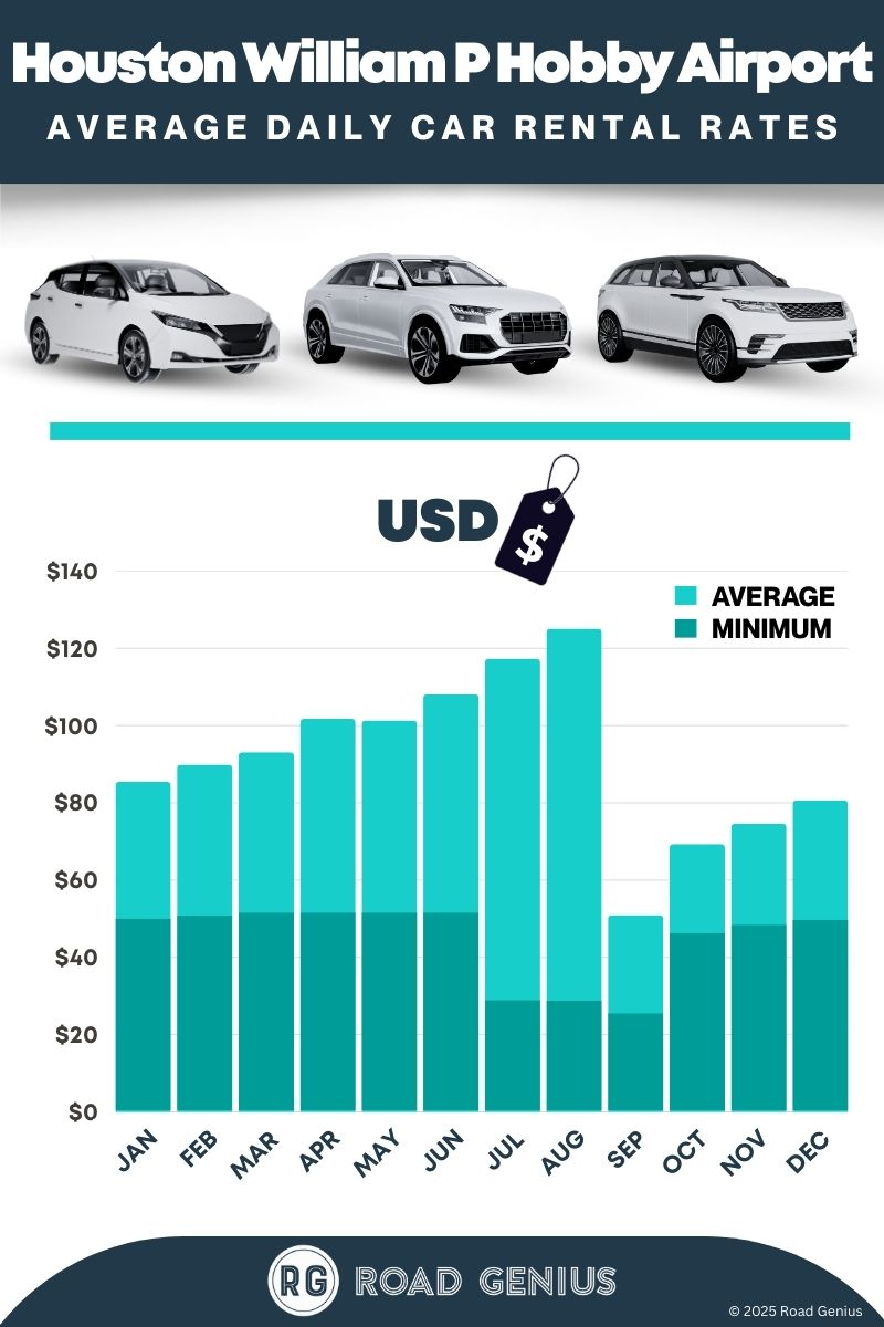 On average, car rentals at Houston William P Hobby Airport cost around $70 per day, with the lowest-priced rentals starting at $25 per day.