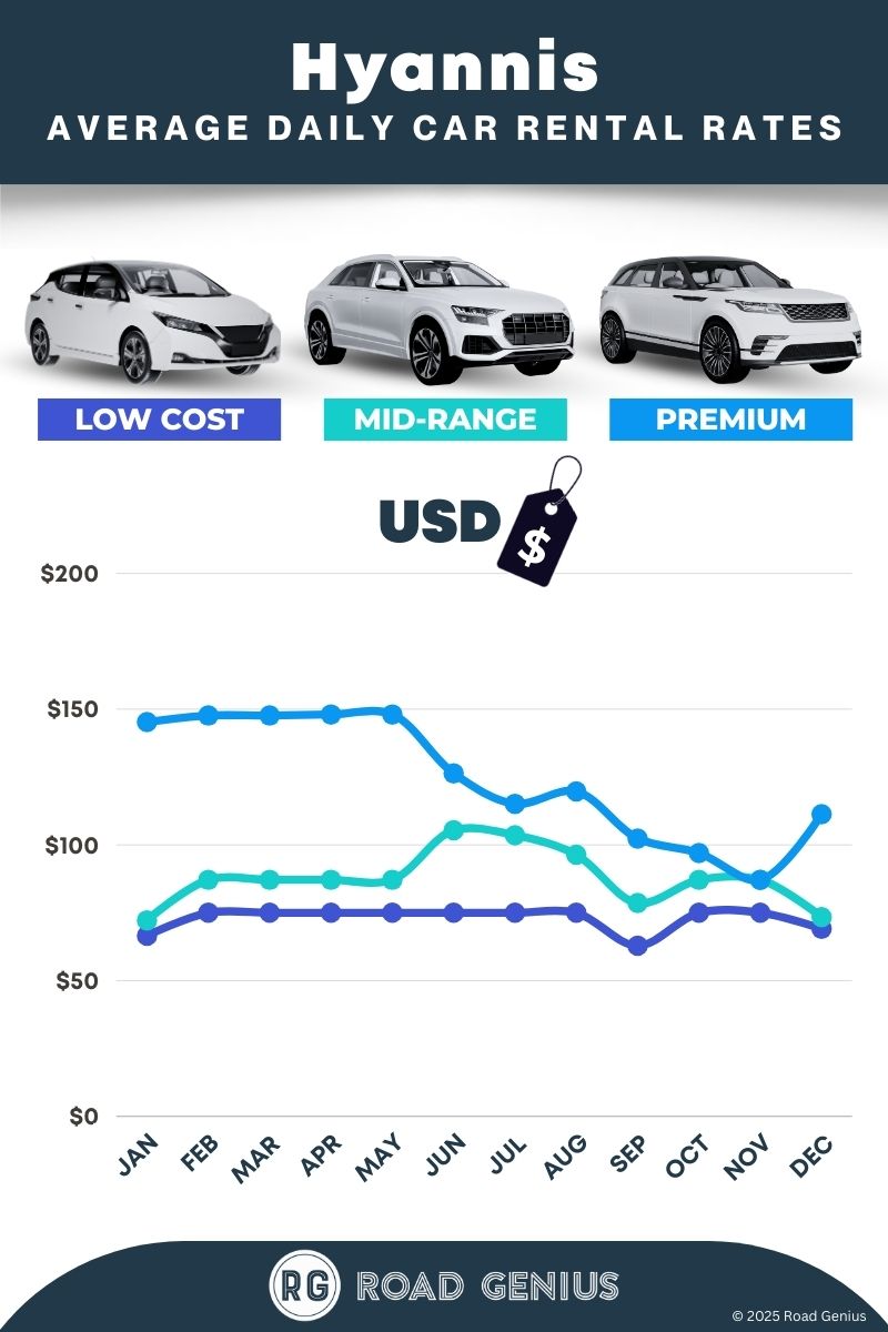On average, car rentals in Hyannis cost around $95 per day, with the lowest-priced rentals starting at $63 per day.