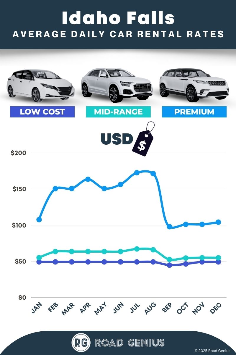On average, car rentals in Idaho Falls cost around $82 per day, with the lowest-priced rentals starting at $45 per day.
