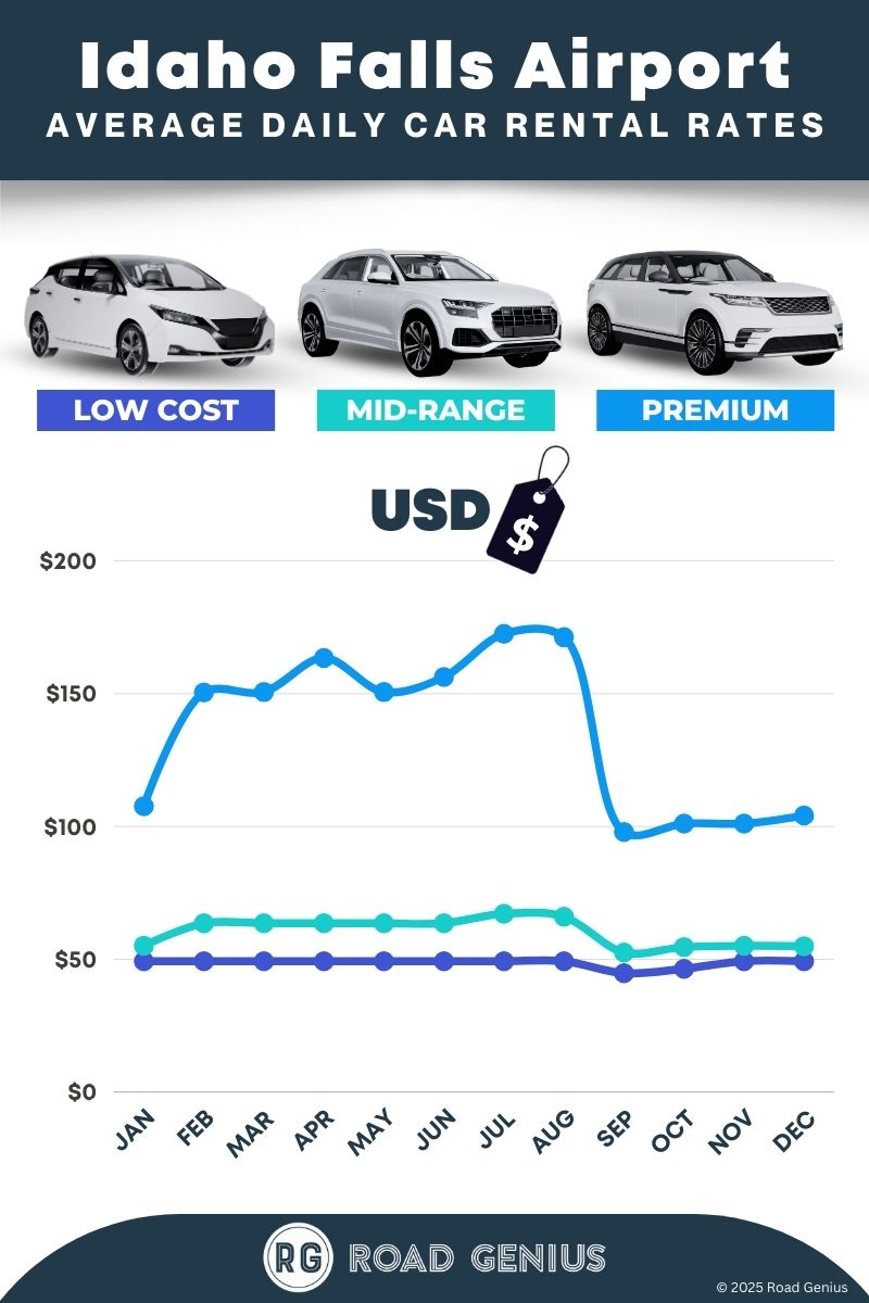 On average, car rentals at Idaho Falls Airport cost around $82 per day, with the lowest-priced rentals starting at $45 per day.