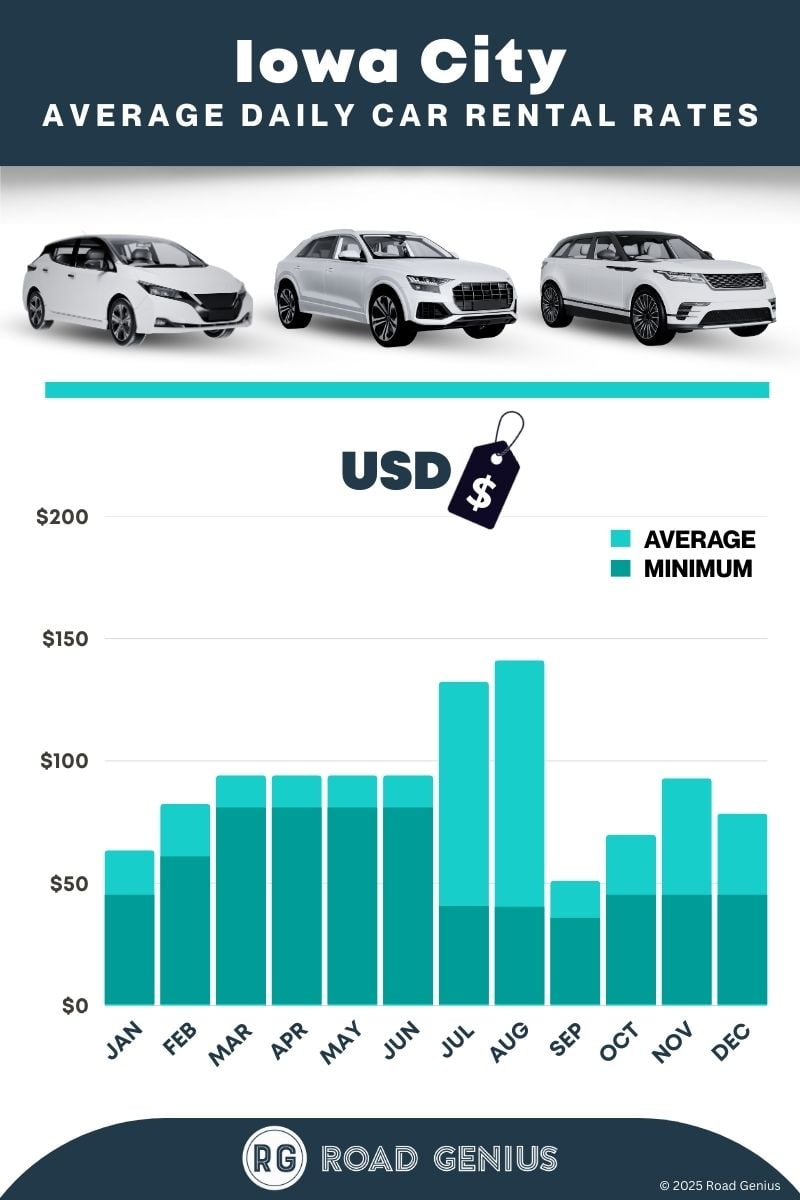 On average, car rentals in Iowa City cost around $79 per day, with the lowest-priced rentals starting at $35 per day.