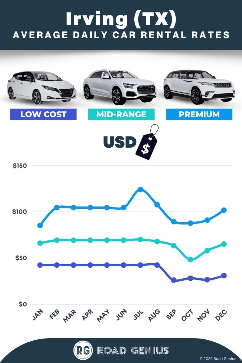 On average, car rentals in Irving (TX) cost around $68 per day, with the lowest-priced rentals starting at $26 per day.