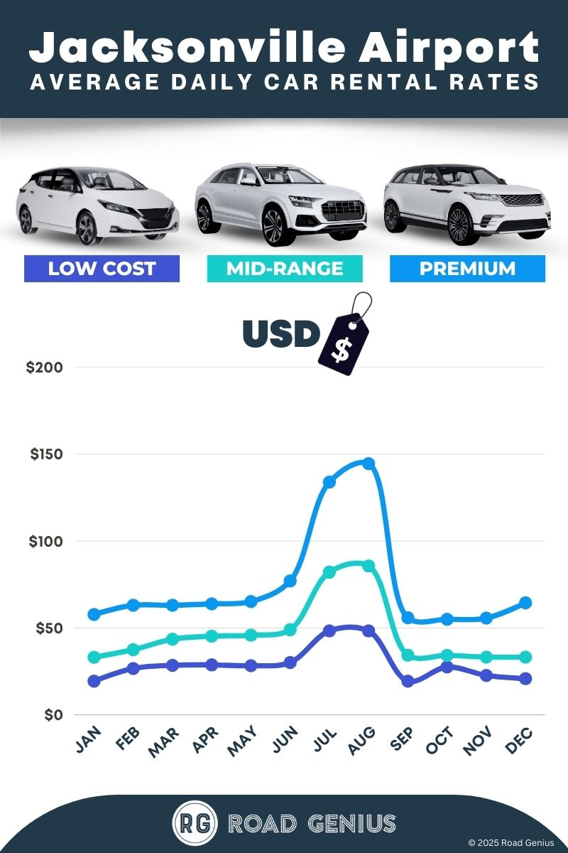 On average, car rentals at Jacksonville Airport cost around $50 per day, with the lowest-priced rentals starting at $19 per day.