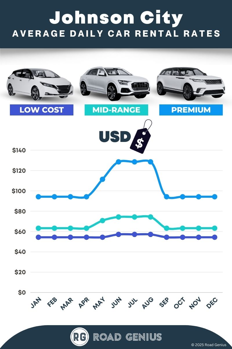 On average, car rentals in Johnson City cost around $75 per day, with the lowest-priced rentals starting at $54 per day.