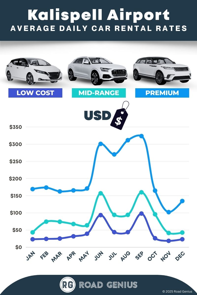 On average, car rentals at Kalispell Airport cost around $110 per day, with the lowest-priced rentals starting at $19 per day.