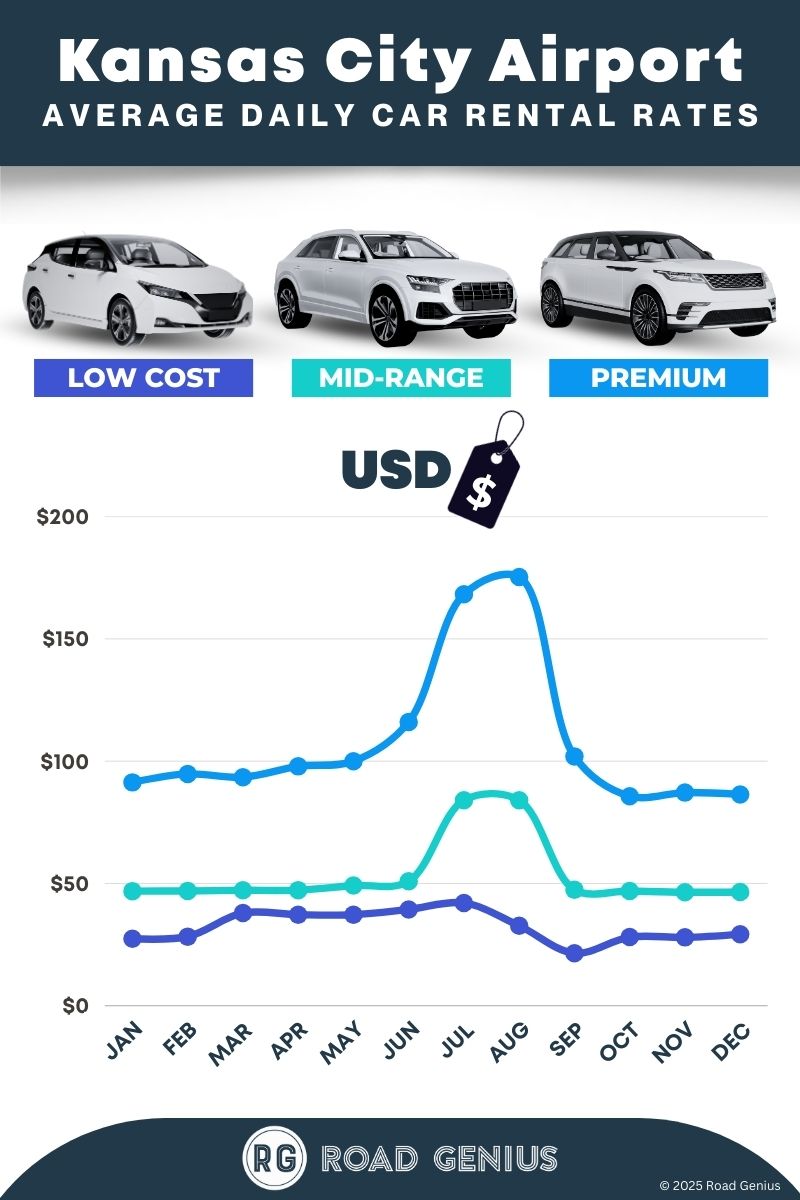 On average, car rentals at Kansas City Airport cost around $65 per day, with the lowest-priced rentals starting at $21 per day.