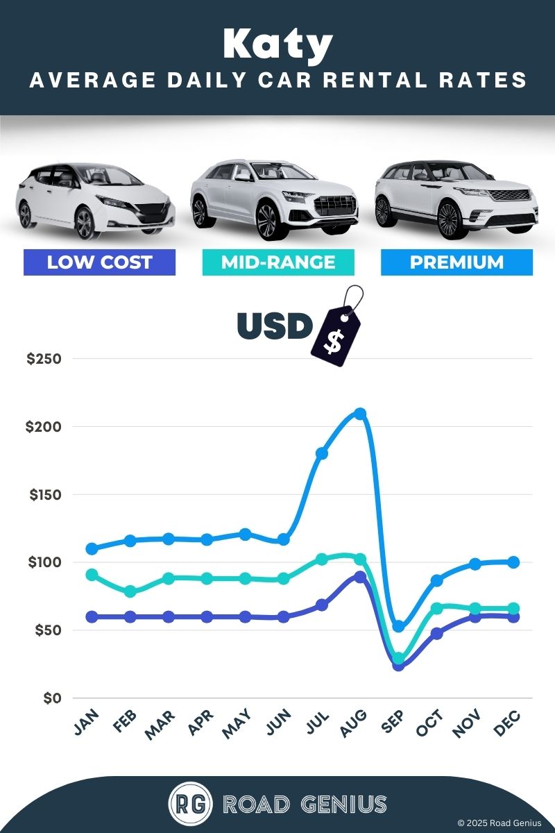 On average, car rentals in Katy cost around $86 per day, with the lowest-priced rentals starting at $24 per day.