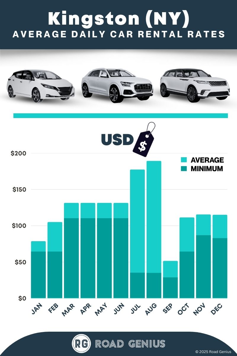 On average, car rentals in Kingston (NY) cost around $106 per day, with the lowest-priced rentals starting at $31 per day.