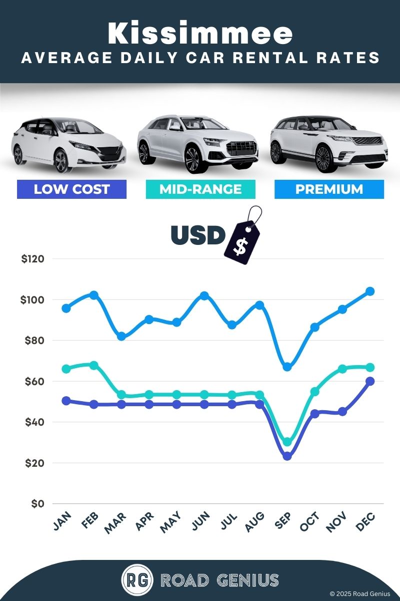On average, car rentals in Kissimmee cost around $65 per day, with the lowest-priced rentals starting at $23 per day.