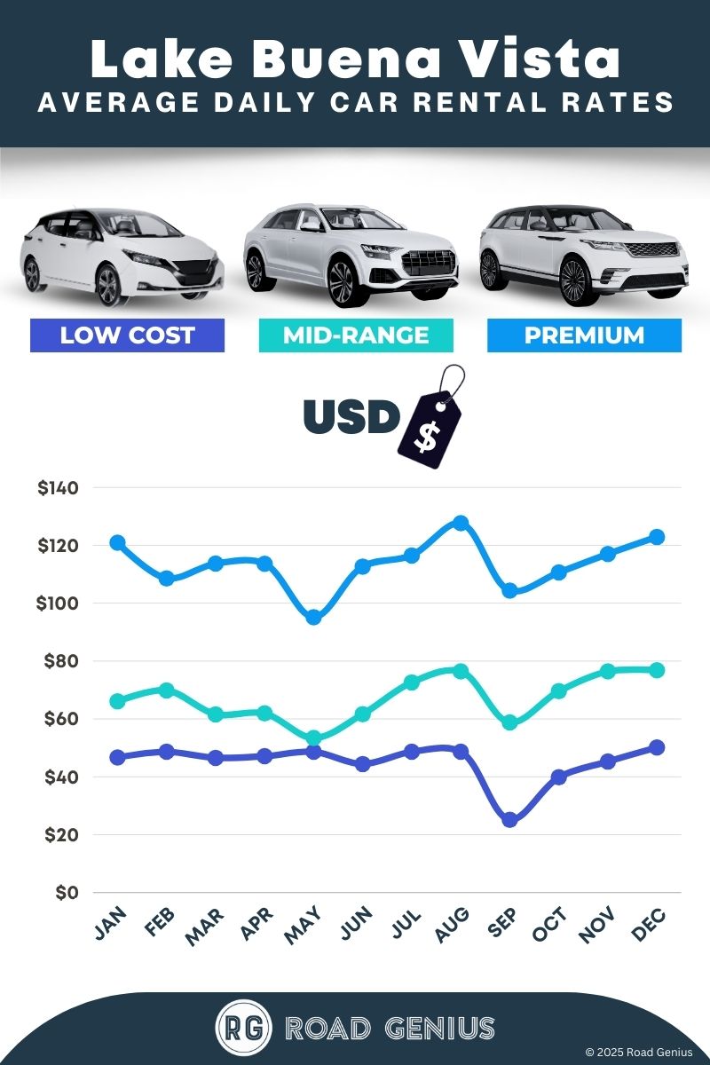 On average, car rentals in Lake Buena Vista cost around $75 per day, with the lowest-priced rentals starting at $25 per day.