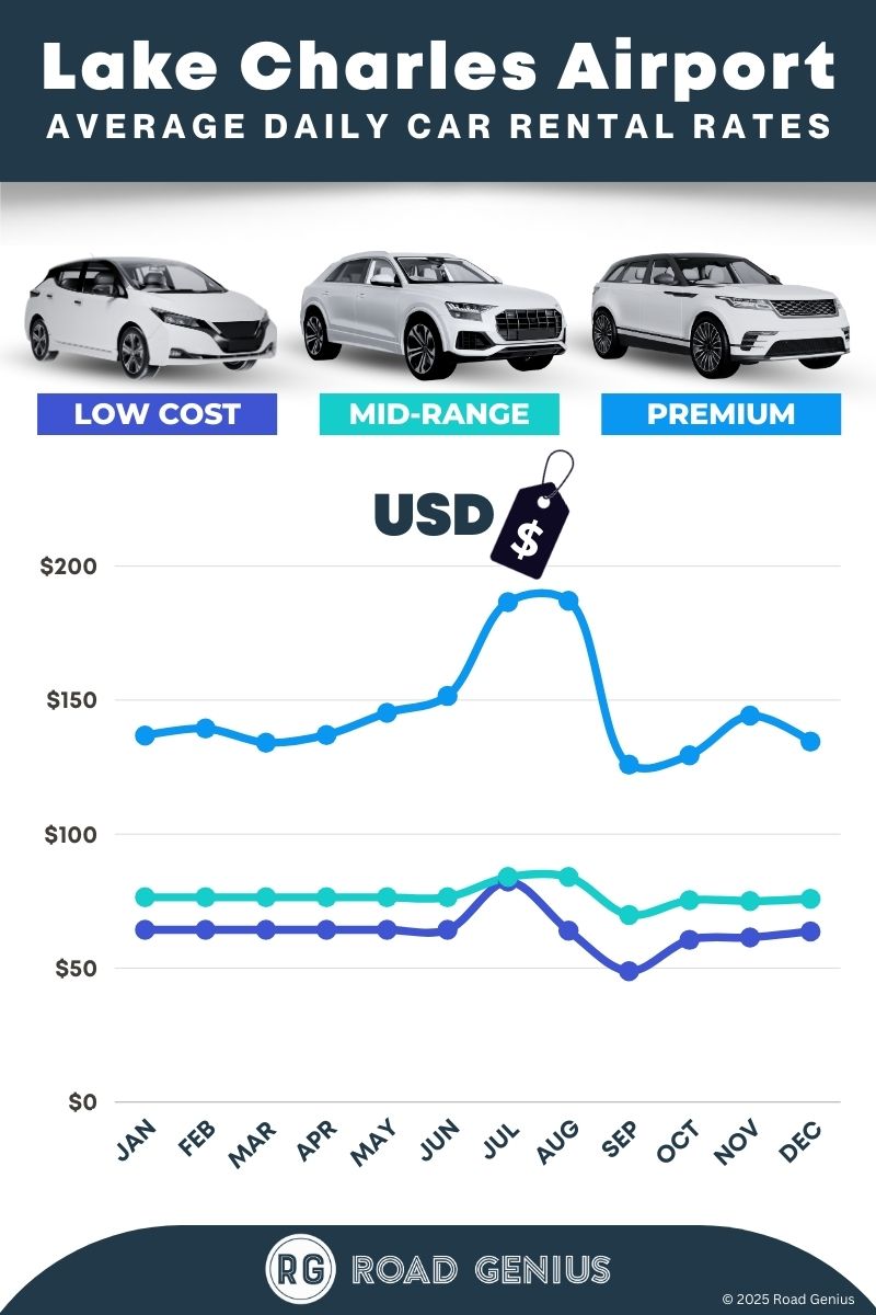 On average, car rentals at Lake Charles Airport cost around $96 per day, with the lowest-priced rentals starting at $49 per day.