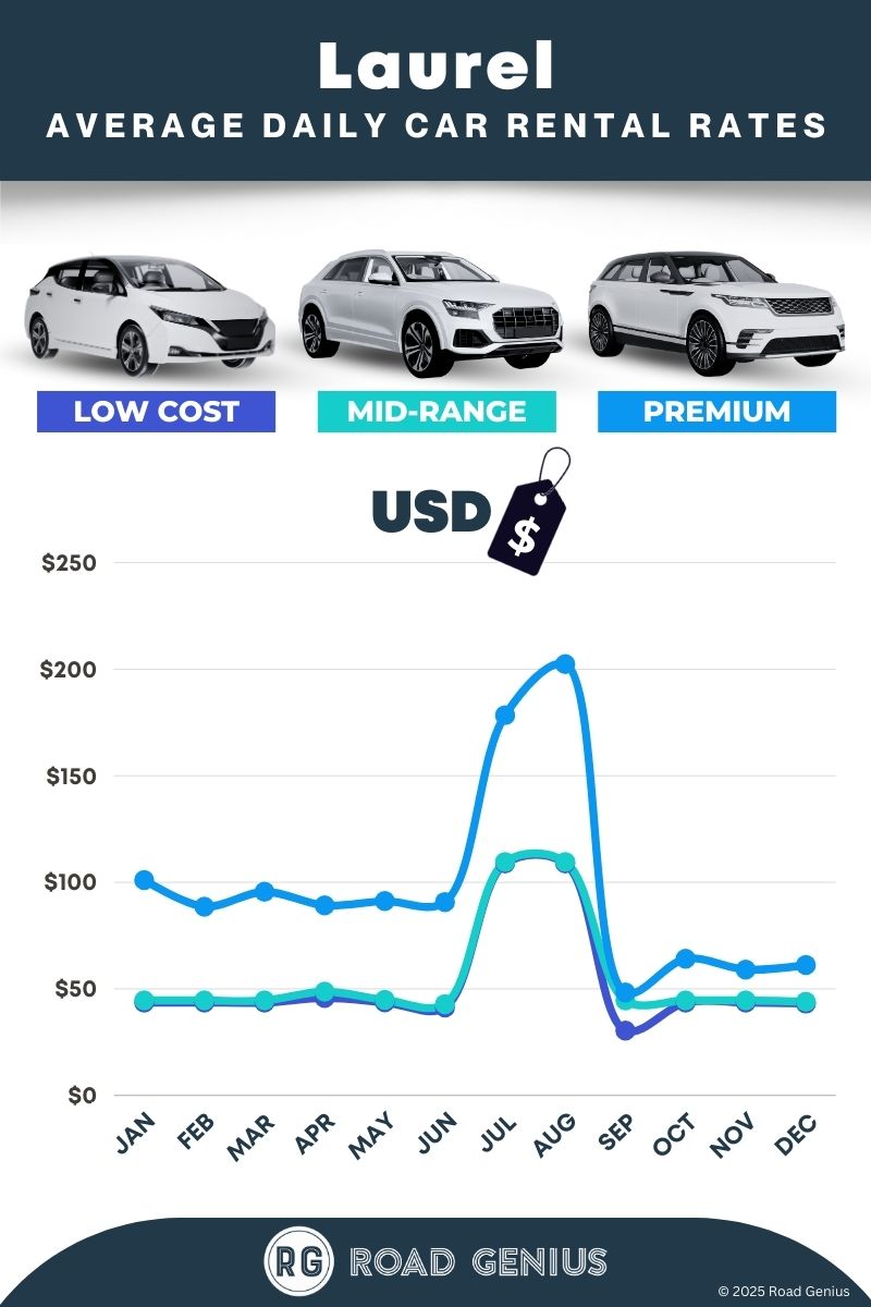 On average, car rentals in Laurel cost around $69 per day, with the lowest-priced rentals starting at $30 per day.