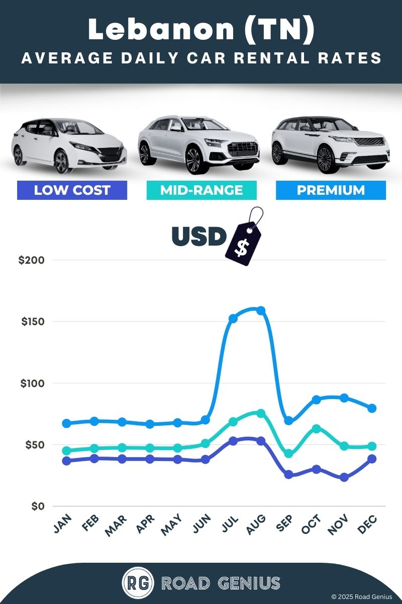 On average, car rentals in Lebanon (TN) cost around $59 per day, with the lowest-priced rentals starting at $24 per day.