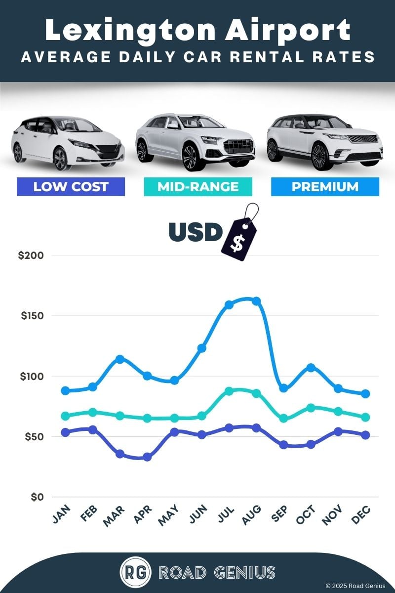 On average, car rentals at Lexington Airport cost around $76 per day, with the lowest-priced rentals starting at $33 per day.