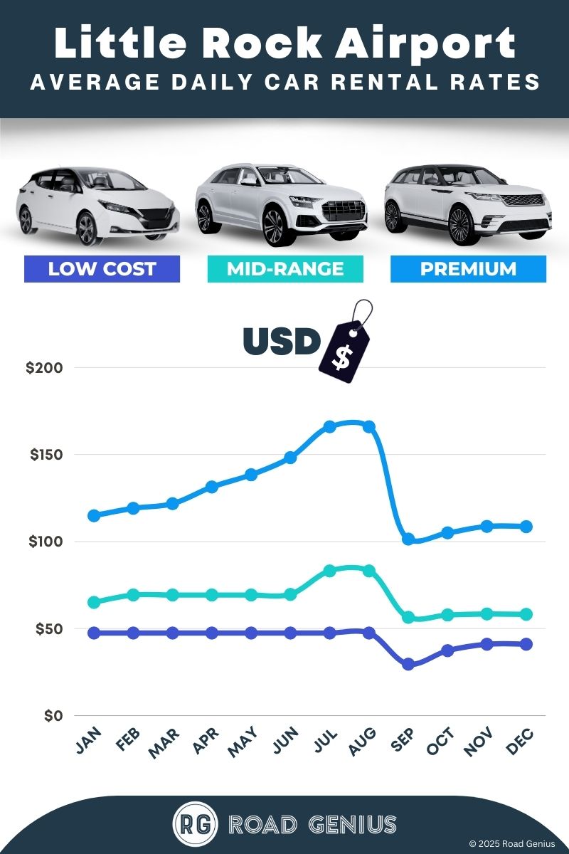 On average, car rentals at Little Rock Airport cost around $80 per day, with the lowest-priced rentals starting at $30 per day.