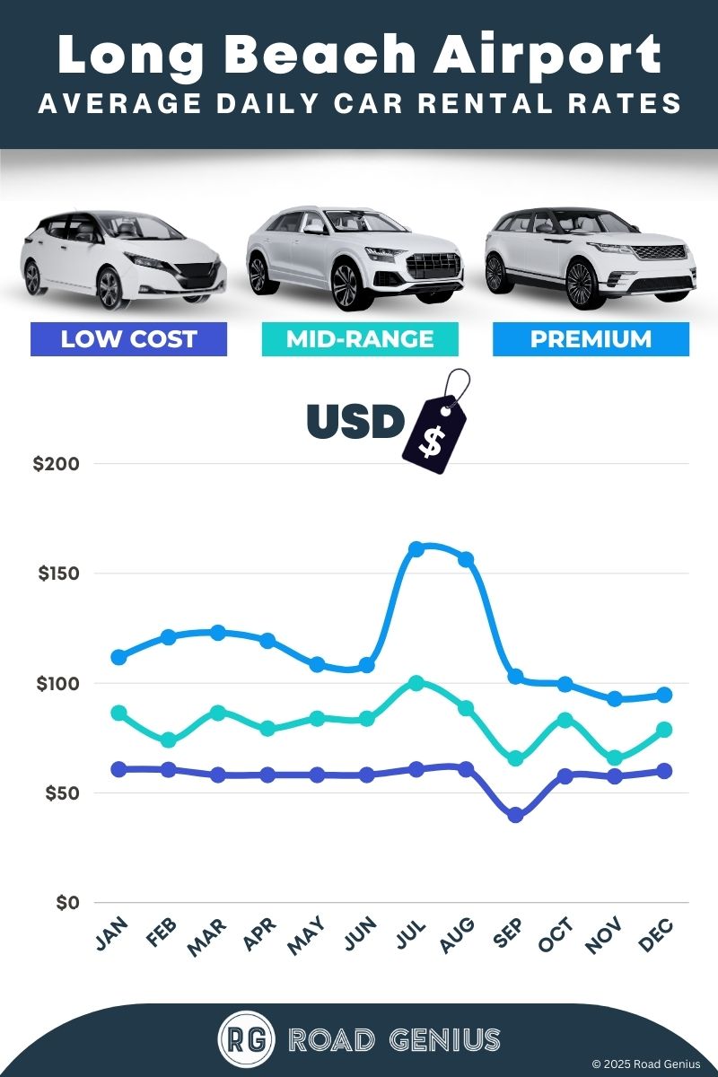 On average, car rentals at Long Beach Airport cost around $85 per day, with the lowest-priced rentals starting at $40 per day.