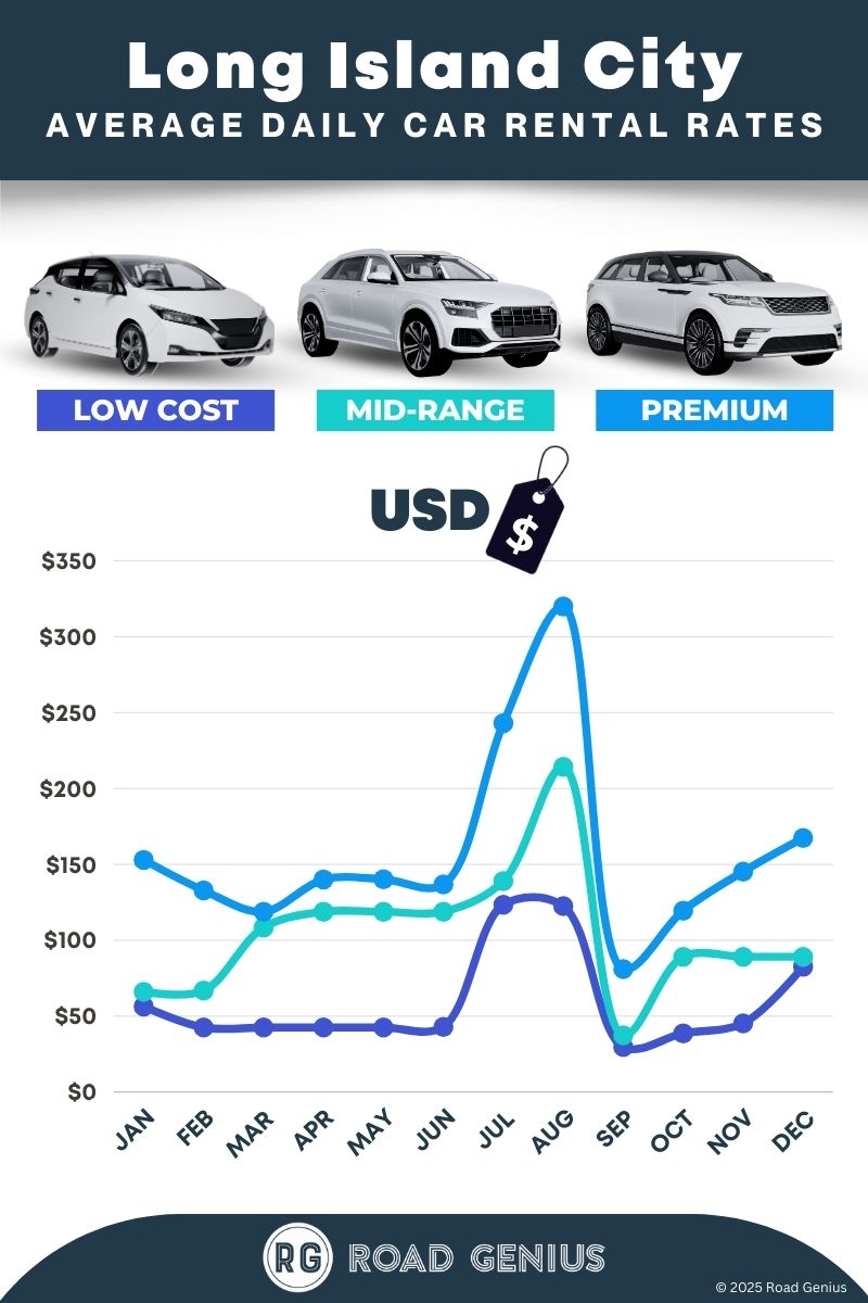On average, car rentals in Long Island City cost around $107 per day, with the lowest-priced rentals starting at $30 per day.