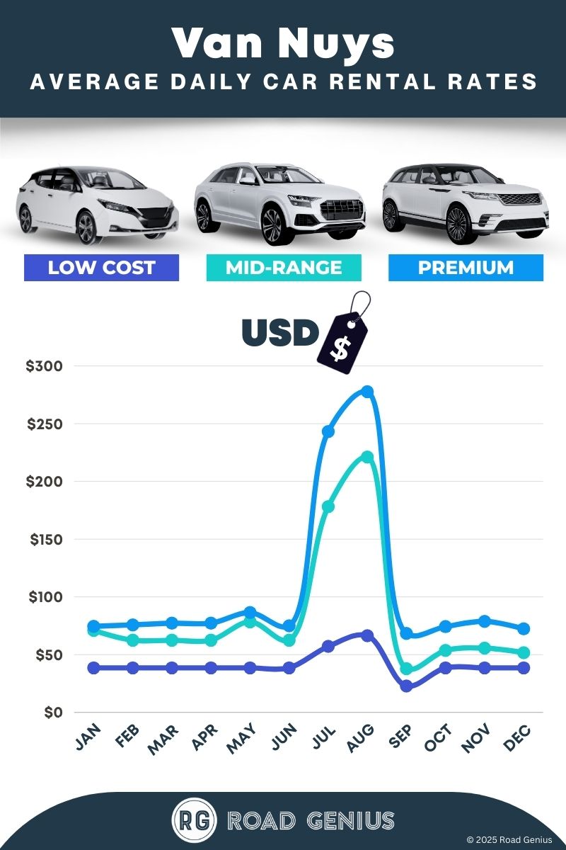 On average, car rentals in Van Nuys cost around $77 per day, with the lowest-priced rentals starting at $23 per day.