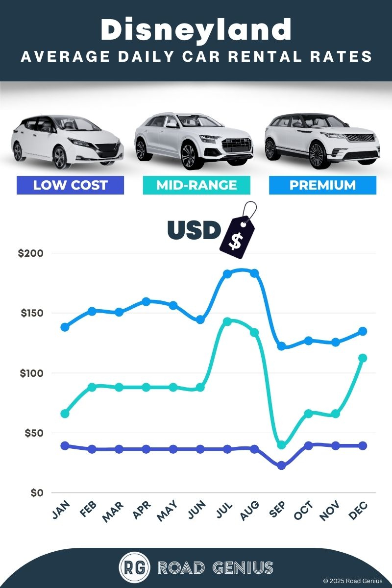 On average, car rentals in Disneyland cost around $91 per day, with the lowest-priced rentals starting at $23 per day.