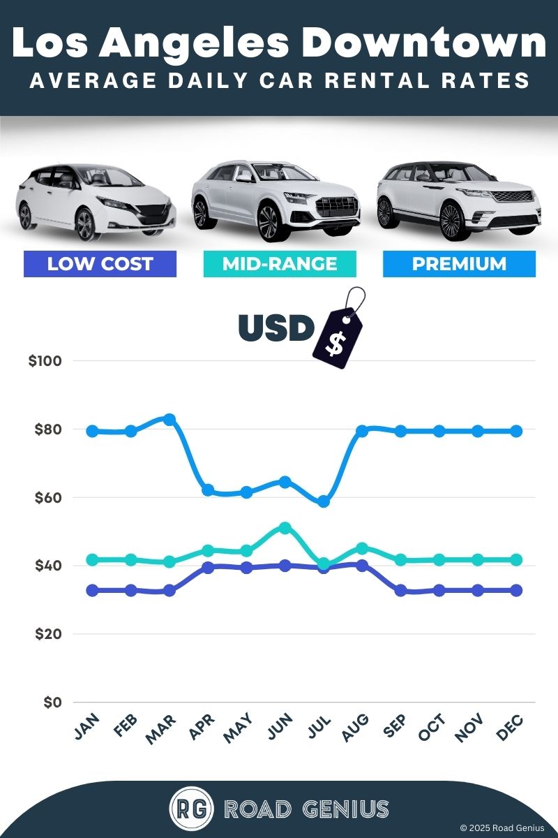 On average, car rentals in Los Angeles Downtown cost around $51 per day, with the lowest-priced rentals starting at $33 per day.
