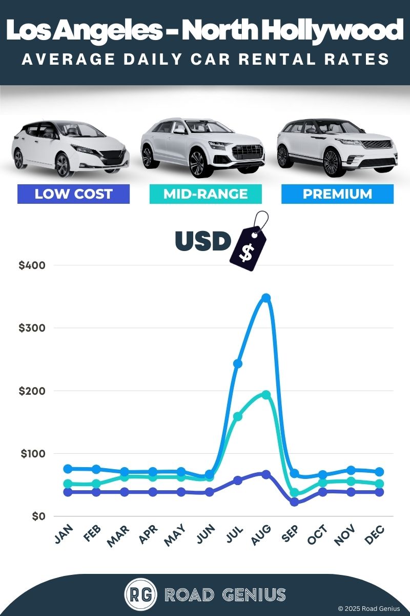 On average, car rentals in Los Angeles - North Hollywood cost around $75 per day, with the lowest-priced rentals starting at $23 per day.