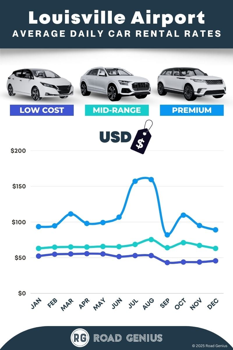 On average, car rentals at Louisville Airport cost around $75 per day, with the lowest-priced rentals starting at $43 per day.