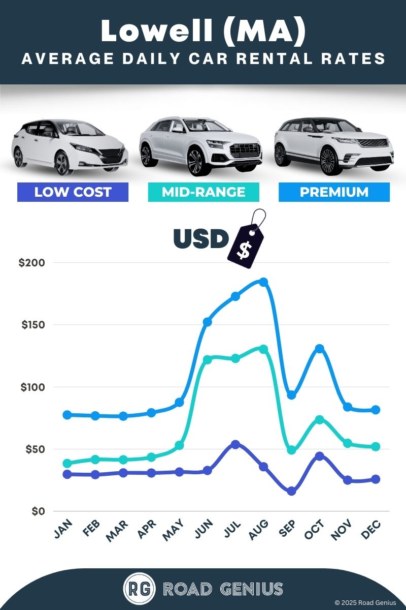 On average, car rentals in Lowell (MA) cost around $70 per day, with the lowest-priced rentals starting at $16 per day.