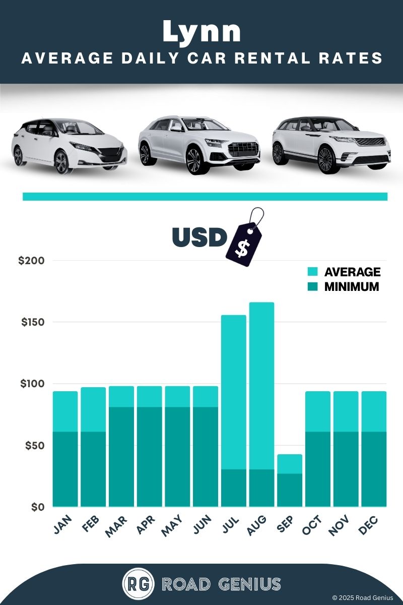 On average, car rentals in Lynn cost around $93 per day, with the lowest-priced rentals starting at $27 per day.
