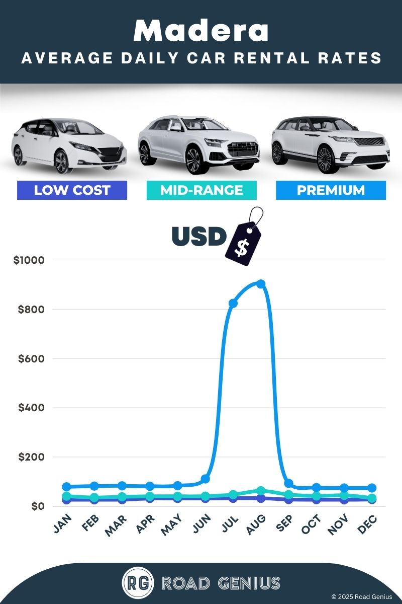 On average, car rentals in Madera cost around $95 per day, with the lowest-priced rentals starting at $26 per day.