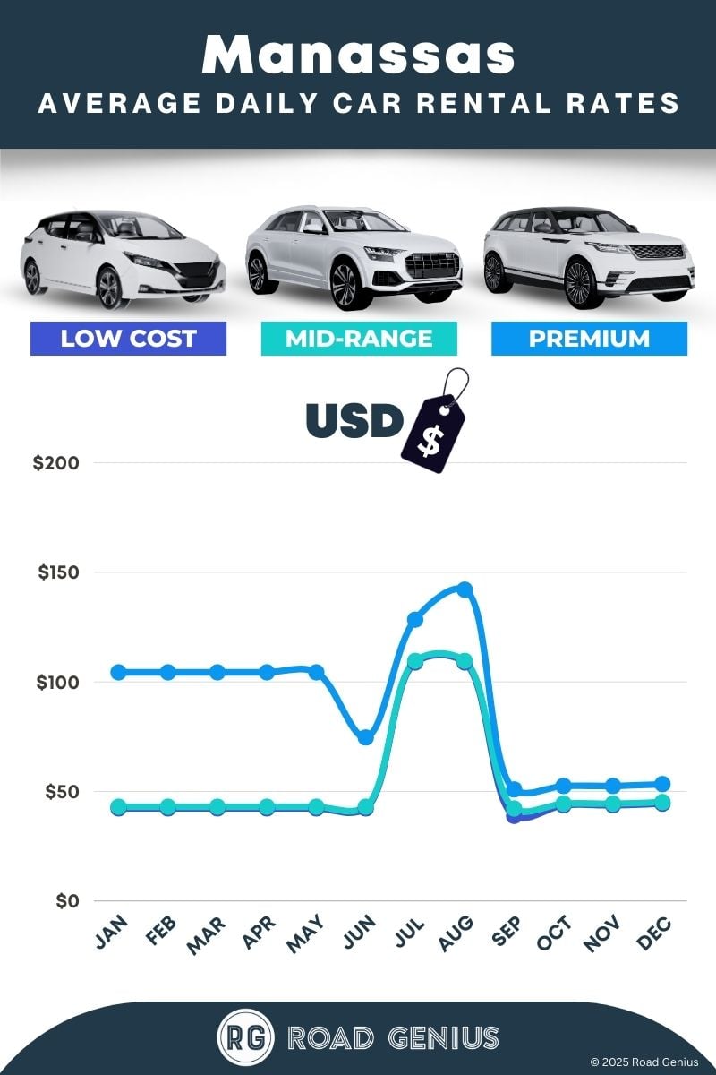 On average, car rentals in Manassas cost around $66 per day, with the lowest-priced rentals starting at $39 per day.