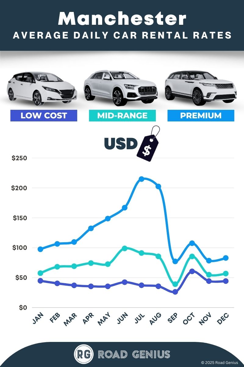 On average, car rentals in Manchester cost around $80 per day, with the lowest-priced rentals starting at $26 per day.