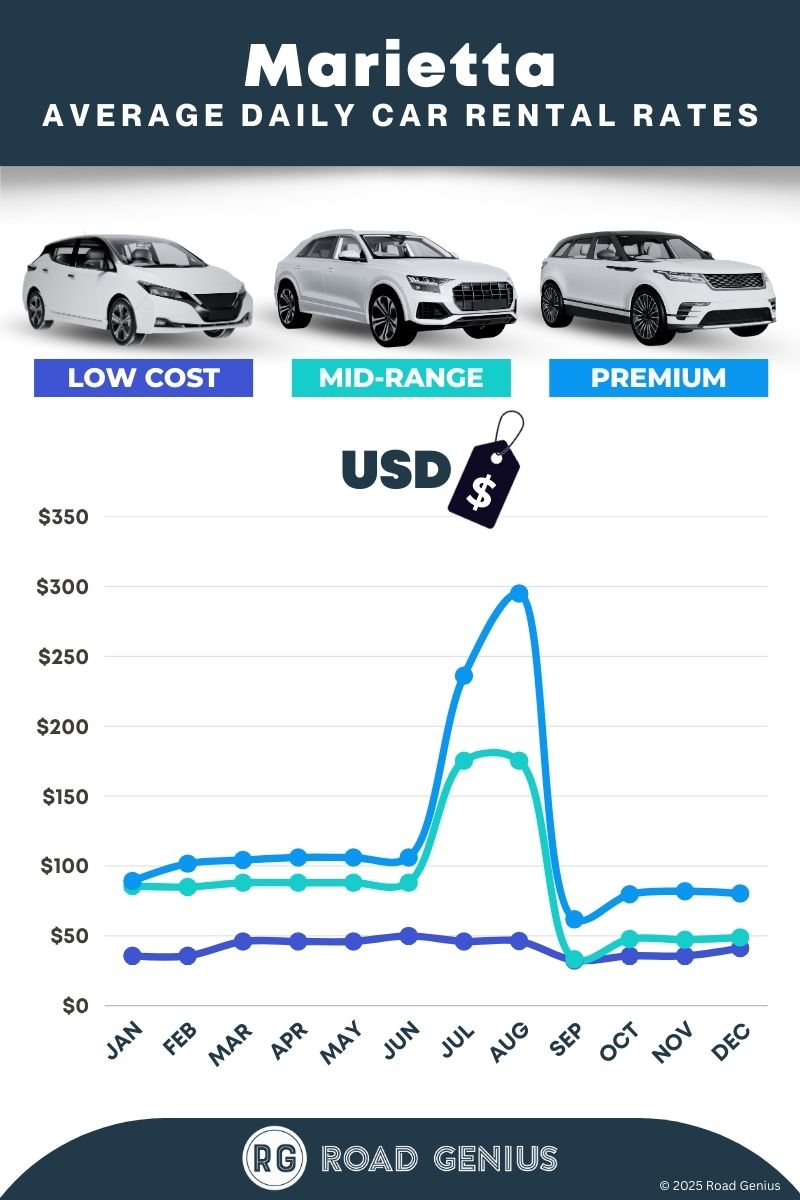 On average, car rentals in Marietta cost around $83 per day, with the lowest-priced rentals starting at $32 per day.