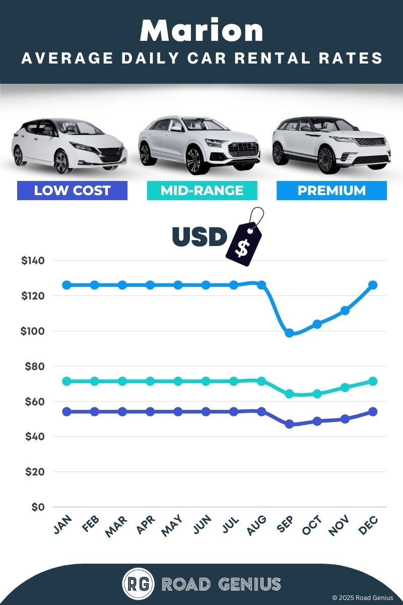 On average, car rentals in Marion cost around $81 per day, with the lowest-priced rentals starting at $47 per day.