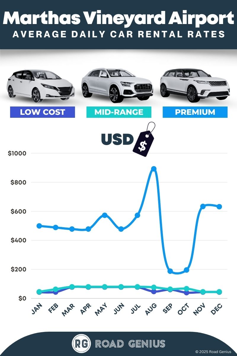 On average, car rentals at Martha's Vineyard Airport cost around $212 per day, with the lowest-priced rentals starting at $39 per day.