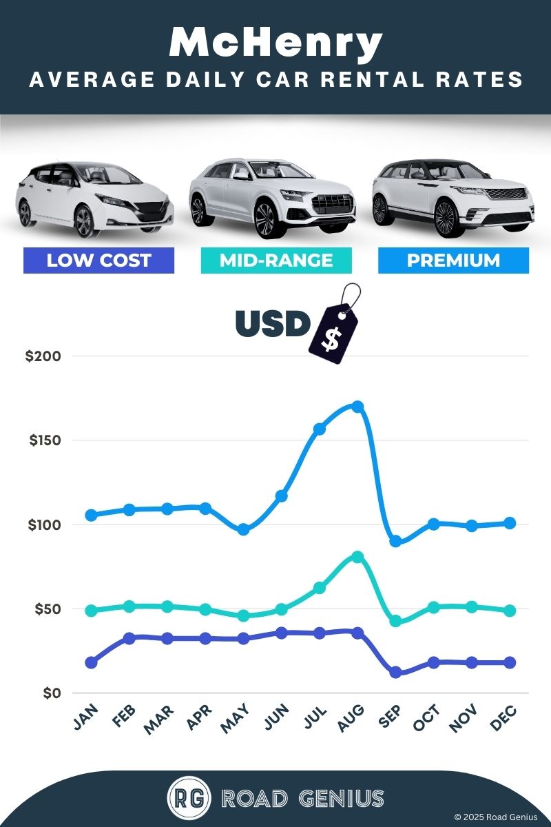 On average, car rentals in McHenry cost around $64 per day, with the lowest-priced rentals starting at $12 per day.