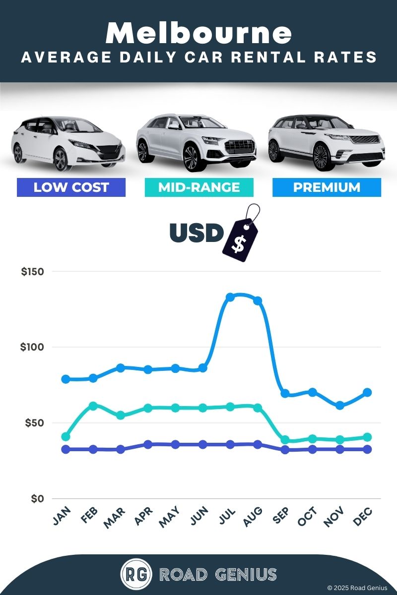 On average, car rentals in Melbourne cost around $57 per day, with the lowest-priced rentals starting at $32 per day.