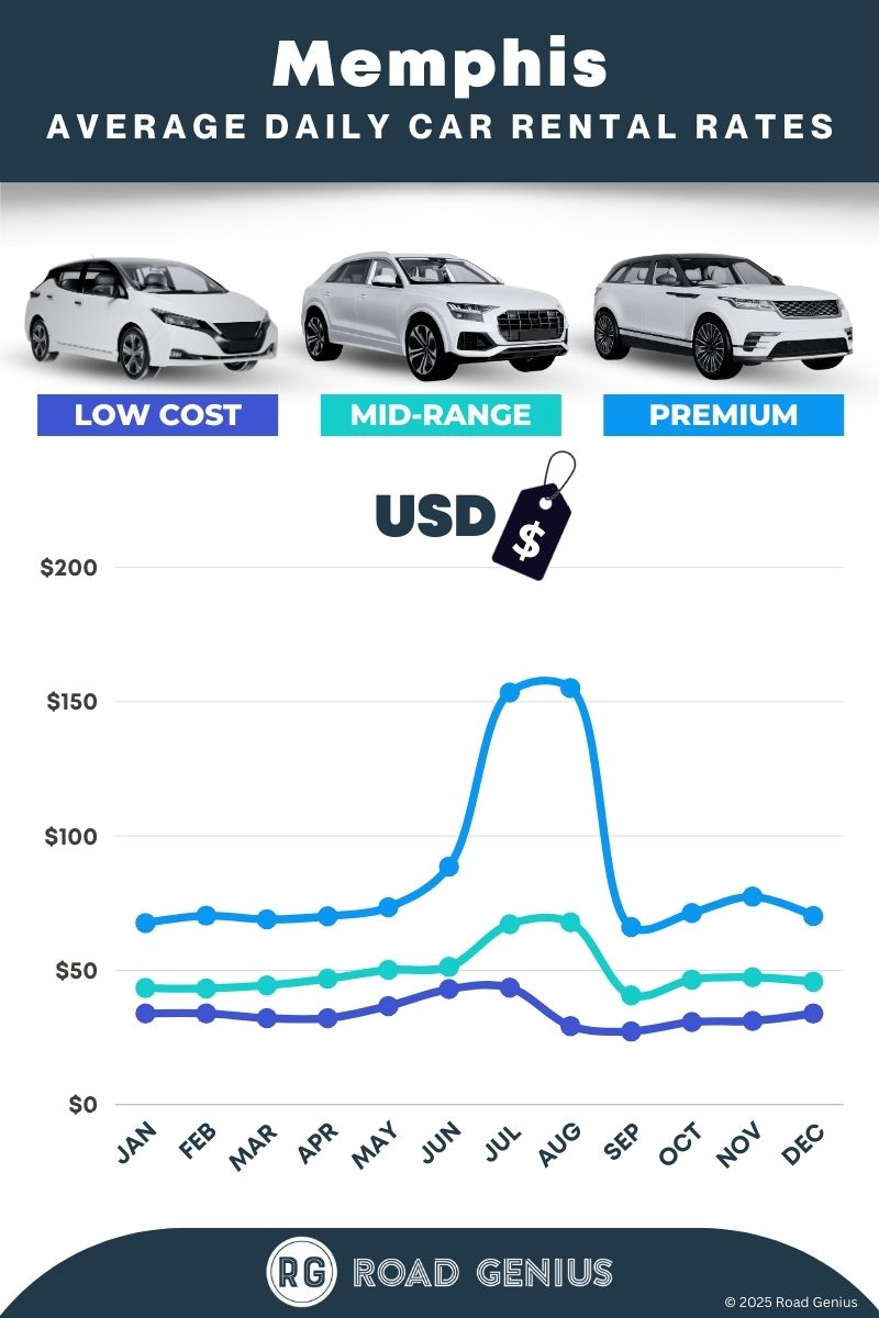 On average, car rentals in Memphis cost around $57 per day, with the lowest-priced rentals starting at $27 per day.