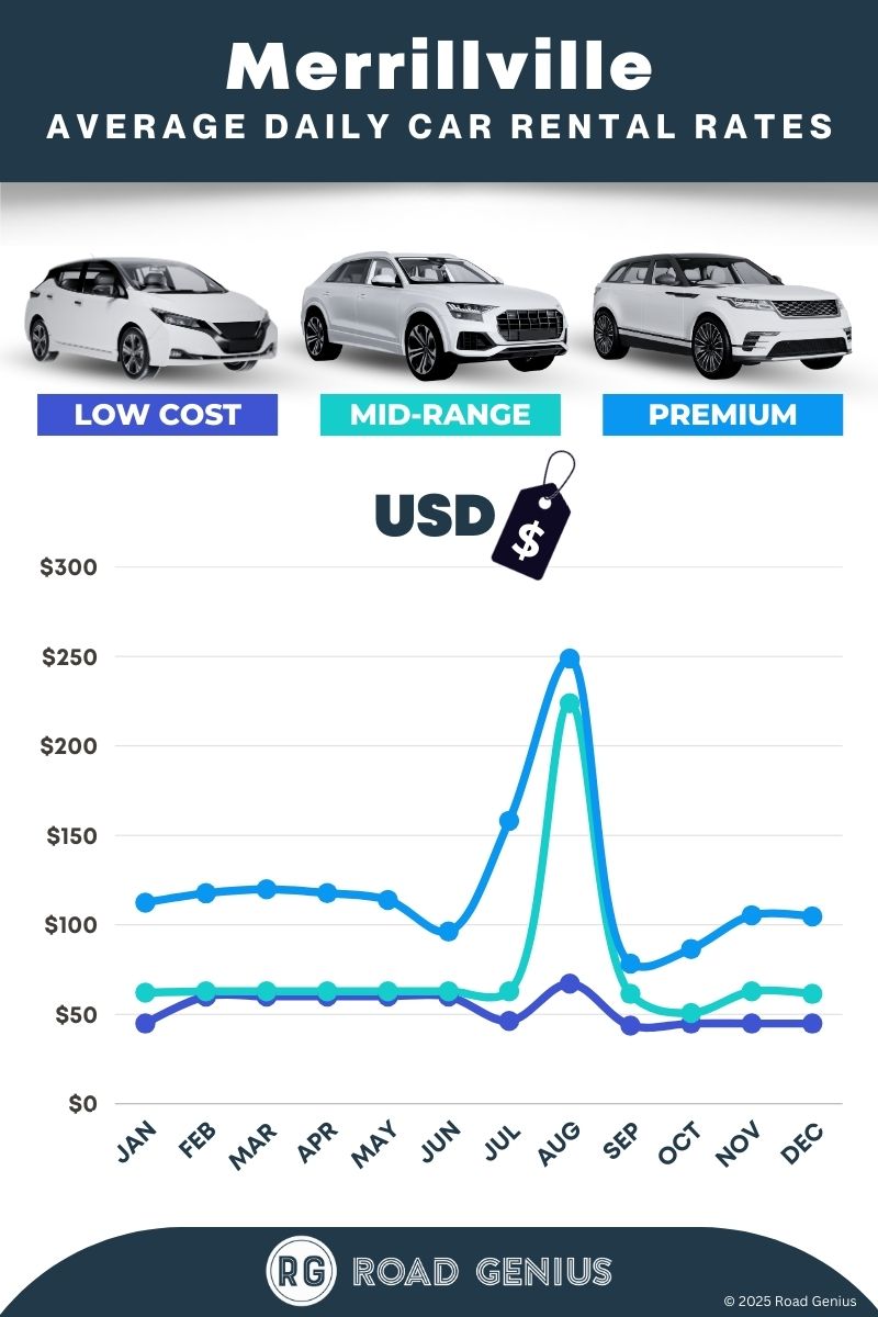 On average, car rentals in Merrillville cost around $83 per day, with the lowest-priced rentals starting at $44 per day.
