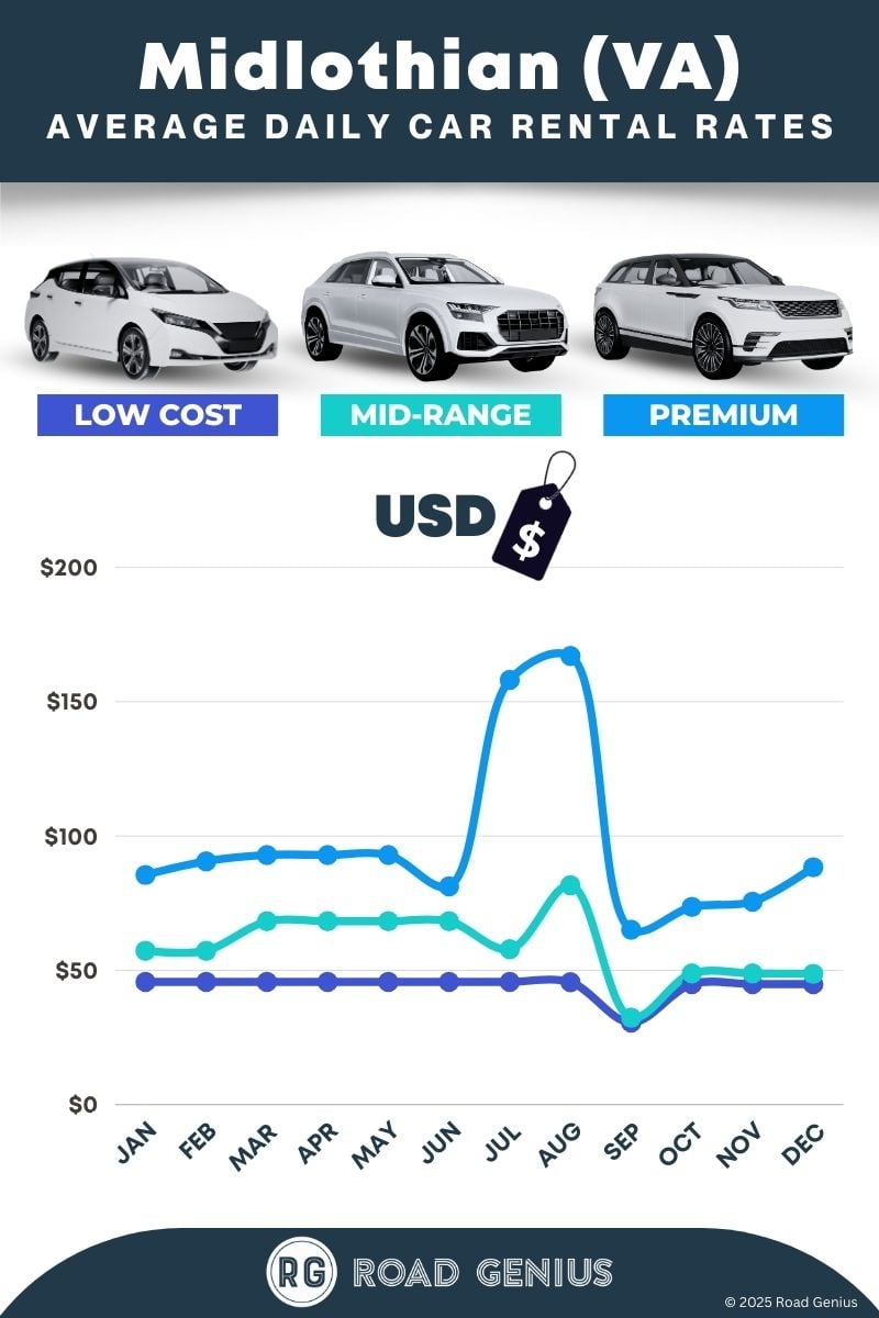 On average, car rentals in Midlothian (VA) cost around $67 per day, with the lowest-priced rentals starting at $31 per day.