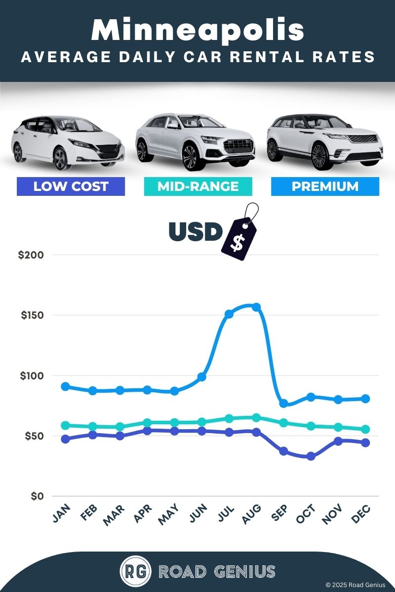 On average, car rentals in Minneapolis cost around $68 per day, with the lowest-priced rentals starting at $33 per day.