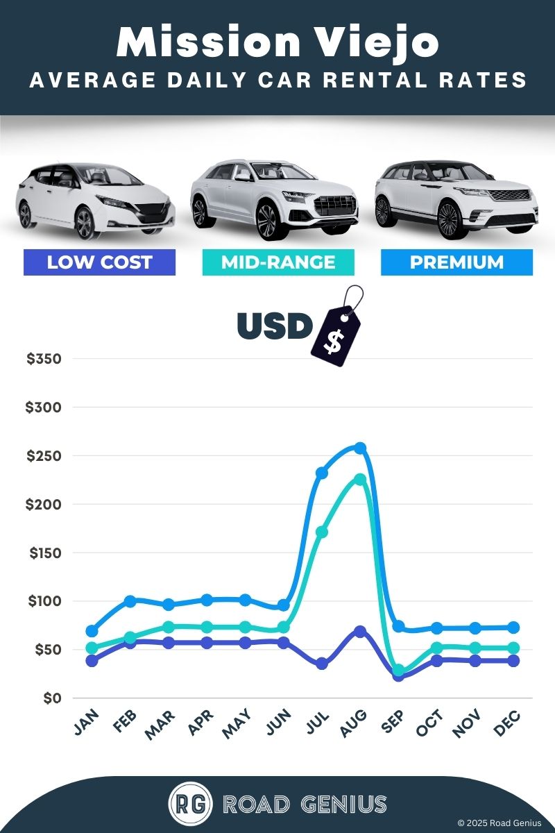 On average, car rentals in Mission Viejo cost around $81 per day, with the lowest-priced rentals starting at $23 per day.
