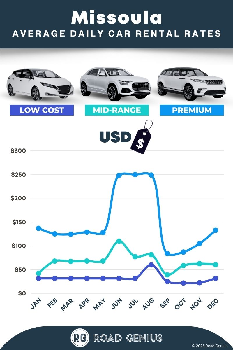 On average, car rentals in Missoula cost around $83 per day, with the lowest-priced rentals starting at $22 per day.